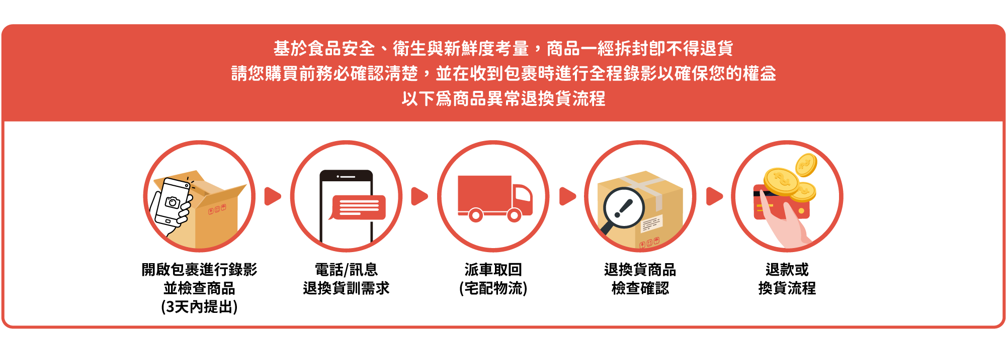 - 在您收到商品時,如因運輸過程造成商品損毀或有商品有重大瑕疵,請直接向宅配業者拒收。若已簽收,請在三天內於平日 09:00~17:30 客服時間內來電 02-29868792